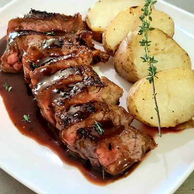 Jugoso filete de res sellado y cocinado en salsa de vino tinto con puré de papa y vegetales salteados.