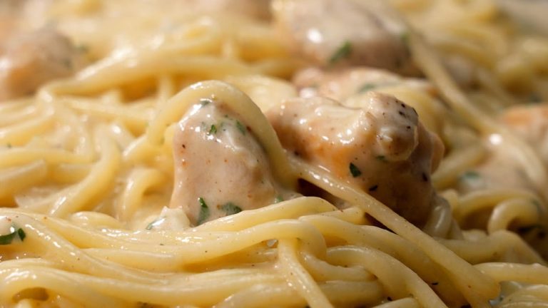 Pasta fettuccine en salsa cremosa de parmesano, con tiras de pollo a la parrilla y toque de perejil.