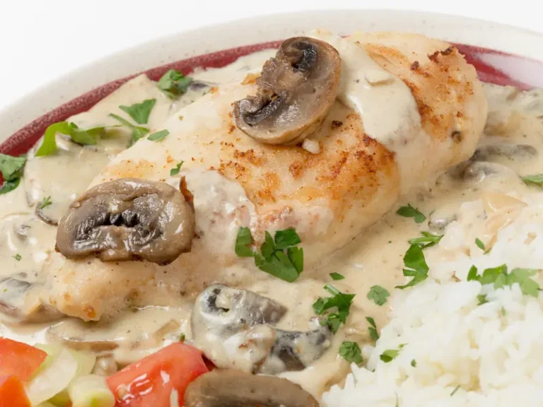 Pechuga de pollo rellena con espinacas frescas y queso crema, servida con salsa de champiñones y arroz blanco.