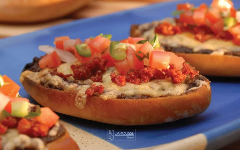 Pan bolillo cubierto con frijoles refritos y queso gratinado, servido con pico de gallo y salsa al gusto.