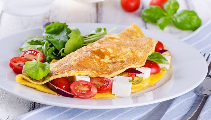 Delicioso omelette relleno con espinacas frescas, tomate deshidratado y queso feta, acompañado de pan artesanal y ensalada mixta.